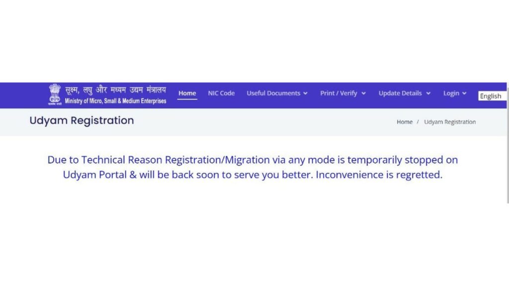 The MSME Government Portal has announced a temporary halt in Udyam registration/migration services due to technical difficulties. Services will resume shortly. We apologize for any inconvenience.